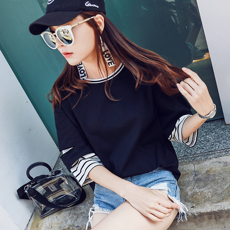 商品名称:韩都衣舍2018新款女装秋韩版条纹假两件秋天黑色短袖T恤