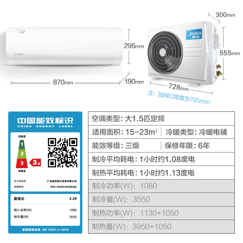 商品名称:Midea/美的 KFR-35GW/WCBD3@ 大1.5匹智能冷暖壁挂式家用空调挂机